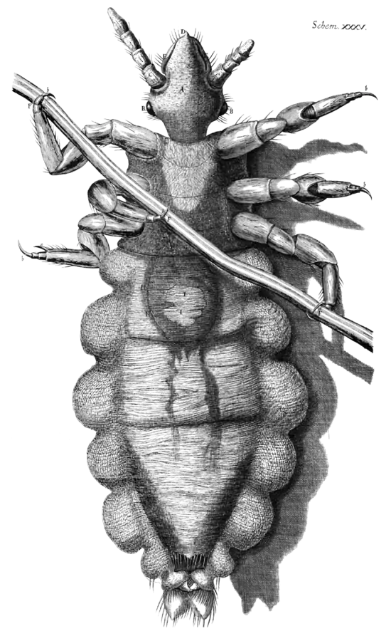 THis is a Creature so officious, that 'twill be known to every one at one time or other, so busie, and so impudent, that it will be intruding it self in every ones company, and so proud and aspiring withall, that it fears not to trample on the best, and affects nothing so much as a Crown; feeds and lives very high, and that makes it so saucy, as to pull any one by the ears that comes in its way, and will never be quiet till it has drawn blood: it is troubled at nothing so much as at a man that scratches his head, as knowing that man is plotting and contriving some mischief against it, and that makes it oftentime sculk into some meaner and lower place, and run behind a mans back, though it go very much against the hair; which ill conditions of it having made it better known then trusted, would exempt me from making any further description of it, did not my faithful Mercury, my Microscope, bring me other information of it. For this has discovered to me, by means of a very bright light cast on it, that it is a Creature of a very odd shape; it has a head shap'd like that exprest in 35. Scheme marked with A, which seems almost Conical, but is a little flatted on the upper and under sides, at the biggest part of which, on either side behind the head (as it were, being the place where other Creatures ears stand) are placed its two black shining goggle eyes B B, looking backwards, and fenced round with several small cilia, or hairs that incompass it, so that it seems this Creature has no very good foresight: It does not seem to have any eye-lids, and therefore perhaps its eyes were so placed, that it might the better cleanse them with its fore-legs; and perhaps this may be the reason, why they so much avoid and run from the light behind them, for being made to live in the shady and dark recesses of the hair, and thence probably their eye having a great aperture, the open and clear light, especially that of the Sun, must needs very much offend them; to secure these eyes from receiving any injury from the hairs through which it passes, it has two horns that grow before it, in the place where one would have thought the eyes should be; each of these C C hath four joynts, which are fringed, as 'twere, with small brisles, from which to the tip of its snout D, the head seems very round and tapering, ending in a very sharp nose D, which seems to have a small hole, and to be the passage through which he sucks the blood. Now whereas if it be plac'd on its back, with its belly upwards, as it is in the 35. Scheme, it seems in several Positions to have a resemblance of chaps, or jaws, as is represented in the Figure by E E, yet in other postures those dark strokes disappear; and having kept several of them in a box for two or three dayes, so that for all that time they had nothing to feed on, I found, upon letting one creep on my hand, that it immediately fell to sucking, and did neither seem to thrust its nose very deep into the skin, nor to open any kind of mouth, but I could plainly perceive a small current of blood, which came directly from its snout, and past into its belly; and about A there seem'd a contrivance, somewhat resembling a Pump, pair of Bellows, or Heart, for by a very swift systole and diastole the blood seem'd drawn from the nose, and forced into the body. It did not seem at all, though I viewed it a good while as it was sucking, to thrust more of its nose into the skin then the very snout D, nor did it cause the least discernable pain, and yet the blood seem'd to run through its head very quick and freely, so that it seems there is no part of the skin but the blood is dispers'd into, nay, even into the cuticula; for had it thrust its whole nose in from D to C C, it would not have amounted to the supposed thickness of that tegument, the length of the nose being not more then a three hundredth part of an inch. It has six legs, covered with a very transparent shell, and joynted exactly like a Crab's, or Lobster's; each leg is divided into six parts by these joynts, and those have here and there several small hairs; and at the end of each leg it has two claws, very properly adapted for its peculiar use, being thereby inabled to walk very securely both on the skin and hair; and indeed this contrivance of the feet is very curious, and could not be made more commodiously and compendiously, for performing both these requisite motions, of walking and climbing up the hair of a mans head, then it is: for, by having the lesser claw (a) set so much short of the bigger (b) when it walks on the skin the shorter touches not, and then the feet are the same with those of a Mite, and several other small Insects, but by means of the small joynts of the longer claw it can bend it round, and so with both claws take hold of a hair, in the manner represented in the Figure, the long transparent Cylinder F F F, being a Man's hair held by it.
