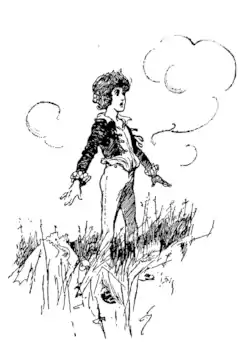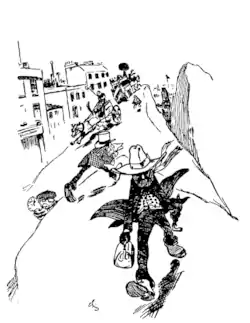 The moment he was outside, he felt a sudden and awful change in himself. He was growing, growing, growing. He hurried out of the town. He felt that it would soon be too small to hold him. Outside he got bigger and bigger till the trees of the nearer forest were like grass under his feet, and the mug ran out of his hand like a little grain of rape-seed. And there beside him stood the Mountain—a little girl in a blue dress—and he was taller than she was.