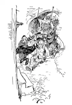 So off they all went, King, Court, heralds, men-at-arms, banner-bearers and spearmen, down the narrow, dark, crooked town streets, till they came to the churchyard where the tombstones were—both the upright and the flat kind.