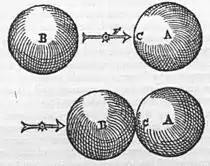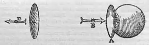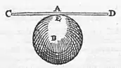 A is an iron plate near the pole, B a versorium which tends with its point towards the centre of the small plate, which has been touched by the pole of the loadstone C. But if the same small plate be placed outside the orbe of magnetick virtue, the point will not turn towards its centre, but the cross E of the same versorium does. But an iron globe interposed (if it is not too large) attracts the * point of the iron on the other side of the stone. For the verticity of that side is the same as that of the adjoining pole of the stone. And this turning of the cusp (that is, of the end touched by that pole) as well as of the cross-end, at a greater distance, takes place with an iron globe interposed, which would not happen at all if * the space were empty, because the magnetick virtue is passed on and continued through magnetick bodies.