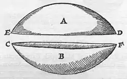 If a loadstone be divided through a meridian into two equal parts, the separate parts mutually repel one another, the poles being * placed directly opposite one another at a convenient and equal distance. They repel one another also with a greater velocity than when pole is put opposite pole incongruously. Just as the part B of the loadstone, placed almost opposite the part A, repels it floating in its skiff, because D turns away from F, and E from C; but if B is exactly joined with A again, they agree and become one body magnetical; but in proximity they raise enmities. But if one part of the stone is turned round, so that C faces D and F faces E, then A pursues B within its orbe until they are united.