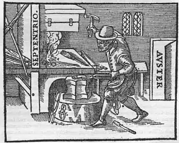 In the Stettin edition of 1633 the artist has gone back to Kiliani's original plate, and has re-etched the design very carefully, but reversing it all right for left. As in the London version of 1600, the dog is omitted, and the words Septentrio and Auster are added. Some of the original details—for example, the vice and one pair of pincers—are left out, but other details, for instance, the cracks in the blocks that support the water-tub, and the dress of the blacksmith, are rendered with slavish fidelity.