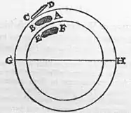 So parts having the same verticity with the whole, when separated, are impelled in the contrary direction; for contrary parts solicit contrary parts. Nor yet is this a true contrariety, but the highest concordancy, and the true and genuine conformation of bodies magnetical in the system of nature, if they shall have been divided and separated: for the parts thus divided should be raised some distance from the whole, as will be made clear afterwards. Magnetick substances seek a unity as regards form; they do not so much respect their own mass. Wherefore the part F E is not attracted into its former bed; but when once it is unsettled and at a distance, it is * solicited by the opposite pole. But if the small piece F E is placed back again in its bed or brought close to, without any substances intervening, it acquires its former combination, and, as a part of the whole once more united, accords with the whole and sticks readily in its former position; and E remains toward A, and F toward B, and they settle steadily in their mother's lap. The reasoning is the same when the stone is divided into equal parts through the poles.
