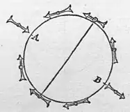 Figures illustrating horizontal directions above the body of a loadstone. All the cusps that have been made southern by rubbing on the boreal pole, or some place round the northern pole A, turn toward the pole A, and turn away from the southern pole B, toward which all the crosses look. I call the direction horizontal, because it is arranged along the plane of the horizon; for nautical and * horological instruments are so constructed that the iron hangs or is supported in æquilibrium on the point of a sharp pin, which prevents the dipping of the versorium, about which we intend to speak later. And in this way it is of the greatest use to man, indicating and distinguishing all the points of the horizon and the winds. Otherwise on every oblique sphere (whether of stone or the earth) versoria and all magnetick substances would have a dip by their own nature below the horizon; and at the poles the directions would be perpendicular, which appears in our discussion On Declination.