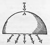 Half a terrella by itself and its directions, unlike the directions * of the two parts close to one another as shown in the figure above. All the cusps have been touched by A; all the crosses below except the middle one tend toward the loadstone, not straight, but obliquely; because the pole is in the middle of the plane which before was the plane of the æquator. All cusps touched by places distant from the pole move toward the pole (exactly the same as if they had been rubbed upon the pole itself), not toward the place where they were rubbed, wherever that may have been in the undivided stone in some latitude between the pole and the æquator. And for this reason there are only two distinctions of regions, northern and southern, in the terrella, just as in the general terrestrial globe, and there is no eastern nor western place; nor are there any eastern or western regions, rightly speaking; but they are names used in respect of one another toward the eastern or western part of the sky. Wherefore it does not appear that Ptolemy did rightly in his Quadripartitum, making eastern and western districts and provinces, with which he improperly connects the planets, whom the common crowd of philosophizers and the superstitious soothsayers follow.