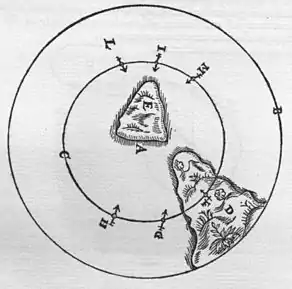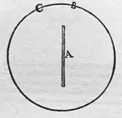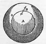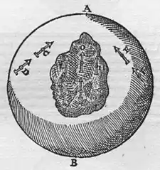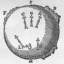 It is shown by a small spike placed over a terrella or by a small versorium; for they are turned by the terrella toward the mass that stands out and toward the large eminences. In the same way on the earth the verticity is perturbed by great continents, which are mostly elevated above the depths of the seas and make the versorium deviate sometimes from the right tracks (that is, from the true meridians). On a terrella it is thus demonstrated: the end of the versorium A is not directed straight to the pole P, if there be a large protuberance B on the terrella; so also the cusp C deviates from the pole because of the eminence F. In the middle between the two eminences the versorium G collimates to the true pole because, being at equal distances from the two eminences B and F, it turns aside to neither, but observes the true meridian, especially when the protuberances are of equal vigour. But the versorium N on the other side varies from the pole M toward the eminences H, and is not held back, stopped, or restrained by the small eminence O on the terrella (as it were, some island of land in the ocean). L, however, being unimpeded, is directed to the pole M. The variation is demonstrated in another way on a terrella, just as on the earth. Let A be the pole of the earth, B the equator, C the parallel circle of latitude of 30 degrees, D a great eminence spread out toward the pole, E another eminence spread out from the pole toward the æquator. It is manifest that in the middle of D the versorium F does not vary; while G is very greatly deflected: but H very little, because it is further removed from D. Similarly also the versorium I placed directly toward E does not deviate from the pole: but L and M turn themselves away from the pole A toward the eminence E.