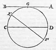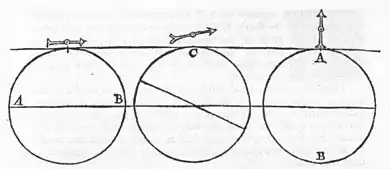 then declination is apparent, and the iron inclines toward the body of the earth in its own meridian. Let A B, for example, be the visible horizon of a place; C D the horizontal through the earth, dividing it into equal parts; E F the axis of the earth; G the position of the place. It is manifest that the boreal pole E is elevated above the point C by as much as G is distant from the æquator. Wherefore, since at E the magnetick needle stands perpendicularly in its proper turning (as we have often shown before), so now at G there is a certain tendency to turn in proportion to the latitude (the magnetick dipping below the plane of the horizon), and the magnetick body intersects the horizon at unequal angles, and exhibits a declination below the horizon. For the same reason, if the declinatory needle be placed at G, its southern end, the one namely which is directed toward the North, dips below the plane of the visible horizon A B. And so there is the greatest difference between a right sphere[232] and a polar or parallel sphere, in which the pole is at the very Zenith. For in a right sphere the needle is parallel to the plane of the horizon; but when the cœlestial pole is vertically overhead, or when the pole of the earth is itself the place of the region, then the needle is perpendicular to the horizon. This is shown by a round stone. Let a small dipping-needle, of two digits length (rubbed with a magnet), be hung in the air like a balance, and let the stone be carefully placed under it; and first let the terrella be at right angles, as in a right sphere, and as in the first figure; for so the magnetick needle will remain in equilibrium. But in an oblique position of the terrella, as in an oblique sphere, and in the second figure, the needle dips obliquely at one end toward the near pole, but does not rest on the pole, nor is its dip ruled by the pole, but by the body and mass of the whole; for the dip in higher latitudes passes beyond the pole. But in the third position of the terrella the needle is perpendicular; because the pole of the stone is placed at the top, and the needle tending straight toward the body reaches to the pole. The cross in the preceding figures always turns toward the boreal pole of the terrella, having been touched by the boreal pole of the terrella; the cusp of the needle, having been touched by the southern pole of the stone, turns to the south. Thus one may see on a terrella the level, oblique, and perpendicular positions of a magnetick needle. *