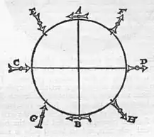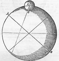 A is the boreal pole of the earth or of a rather large terrella, B the southern, C a smaller terrella, E the southern pole of the smaller terrella, dipping in the northern regions[233]. The centre C is placed on the surface of the larger terrella, because the smaller terrella shows some variation on account of the length of the axis; inappreciable, however, on the earth. Just as a magnetick needle dips in a regional latitude of 50 degrees, so also the axis of a stone (of a spherical stone, of course) is depressed below the horizon, and its natural austral pole falls, and its boreal pole is raised on the south toward the Zenith. In the same way also a circular disc of iron behaves, which has been carefully touched at opposite parts on its circumference; but the magnetical experiments are less clear on account of the feebler forces in round pieces of iron.