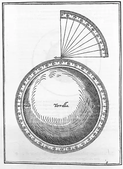 ake a terrella of the best strong loadstone, and homogeneous throughout, not weakened by decay or by a flaw in any parts; let it be of a fair size, so that its diameter is six or seven digits; and let it be made exactly spherical. Having found its poles according to the method already shown, mark them with an iron tool; then mark also the æquinoctial circle. Afterwards in a thick squared block of wood, one foot in size, make a hemispherical hollow, which shall hold half of the terrella, and such that exactly one half of the stone shall project above the face of the block. Divide the limb close to this cavity (a circle having been drawn round it for a meridian) into 4 quadrants, and each of these into 90 degrees. Let the terminus of the quadrants on the limb be near the centre of a quadrant described on the block, also divided into 90 degrees. At that centre let a short, slender versorium (its other end being rather sharp and elongated like a pointer) be placed in æquilibrio on a suitable pin. It is manifest that when the poles of the stone are at the starting points of the quadrants, then the versorium lies straight, as if in æquilibrio, over the terrella. But if you move the terrella, so that the pole on the left hand rises, then the versorium rises on the meridian in proportion to the latitude, and turns itself as a magnetick body; and on the quadrant described on the flat surface of the wood, the degree of its turning or of the declination is shown by the versorium. The rim of the cavity represents a meridional circle, to which corresponds some meridian circle of the terrella, since the poles on both sides are within the circumference of the rim itself. These things clearly always happen on the same plan on the earth itself when there is no variation; but when there is variation, either in the direction or in the declination (a disturbance, as it were, in the true turning, on account of causes to be explained later), then there is some difference. Let the quadrant be near the limb, or have its centre on the limb itself, and let the versorium be very short, so as not to touch the terrella, because with a versorium that is longer or more remote, there is some error; for it has a motion truly proportionate to the terrella only on the surface of the terrella. But if the quadrant, being far distant from the terrella, were moved within the orbe of virtue of the terrella toward the pole on some circle concentrick with the terrella, then the versorium would indicate the degrees of declination on the quadrant, in proportion to and symmetrically with that circle, not with the terrella.