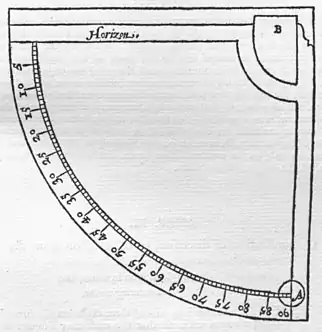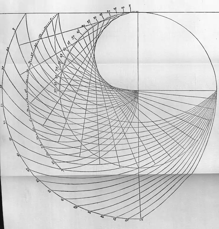 We may see how far from unproductive magnetick philosophy is, how agreeable, how helpful, how divine! Sailors when tossed about on the waves with continuous cloudy weather, and unable by means of the cœlestial luminaries to learn anything about the place or the region in which they are, with a very slight effort and with a small instrument are comforted, and learn the latitude of the place. With a declination instrument the degree of declination of the magnetick needle below the horizon is observed; that degree is noted on the inner arc of the quadrant, and the quadrant is turned round about the centre of the instrument until that degree on the quadrant touches the spiral line; then in the open space B at the centre of the quadrant the latitude of the region on the circumference of the globe is discerned by means of the fiducial line A B. Let the diagram be fixed on a suitable flat board, and let the centre of the corner A of the quadrant be fastened to the centre of it, so that the quadrant may rotate on that centre. But it must be understood that there is also in certain places a variation in the declination on account of causes already mentioned (though not a large one), which it will be an assistance also to allow for on a likely estimate; and it will be especially helpful to observe this variation in various places, as it seems to present greater difficulty than the variation in direction; but it is easily learnt with a declination instrument, when it dips more or less than the line in the diagram.