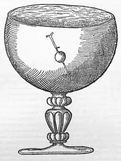 - "Then you shall take a deepe Glasse, Bowle, Cuppe, or other vessell, and fill it with fayre water, setting it in some place where it may rest quiet, and out of the winde. This done, cut the Corke circumspectly, by little and little, untill the wyre with the Corke be so fitted, that it may remain under the superficies of the water two or three inches, both ends of the wyer lying levell with the superficies of the water, without ascending or descending, like to the beame of a payre of ballance beeing equalie poysed at both ends.