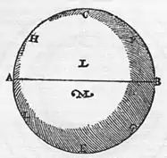 Let E F G be the Earth's globe, A its centre, L E the ascending effluvia: Just as the orbe of the effluvia progresses with the Earth, so also does the unmoved part of the circle at the straight line L E progress along with the general revolution. At L and E, a heavy body, M, falls perpendicularly toward E, taking the shortest way to the centre, nor is that right movement of weight, or of aggregation compounded with a circular movement, but is a simple right motion, never leaving the line L E. But when thrown with an equal force from E toward F, and from E toward G, it completes an equal distance on either side, even though the daily rotation of the Earth is in process: just as twenty paces of a man mark an equal space whether toward East or West: so the Earth's diurnal motion is by no means refuted by the illustrious Tycho Brahe, through arguments such as these.
