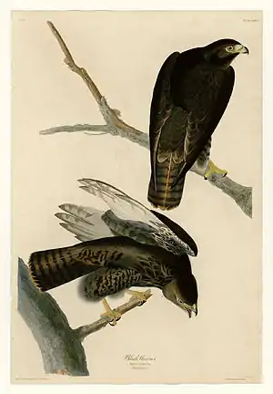 The Hawks now before you were discovered near St Francisville, in Louisiana, during my late sojourn in that State, and had bred in the neighbourhood of the place where I procured them, for two seasons, although they had always eluded my search, until, at last, as I was crossing a large cotton field, one afternoon, I saw the female represented in the Plate standing perched on the top of a high belted tree in an erect and commanding attitude. It looked so like the Black Hawk (Falco niger) of Wilson, that I apprehended what I had heard respecting it might prove incorrect. I approached it, however, when, as if it suspected my evil intentions, it flew off, but after at first sailing as if with the view of escaping from me, passed over my head, when I shot at it, and brought it winged to the ground. No sooner had I inspected its eye, its bill, and particularly its naked legs, than I felt assured that it was, as had been represented by those persons who had spoken to me of its exploits, a new species. I drew it whilst alive; but my intentions of preserving it and carrying it to England as a present to the Zoological Society were frustrated by its refusing food. It died in a few days, when I preserved its skin, which, along with those of other rare birds, I have since given to the British Museum, through my friend J. G. Children, Esq. of that Institution.