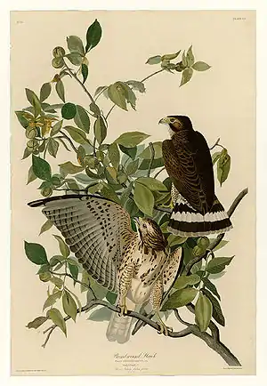 The Broad-winged Hawk is seldom seen in Louisiana, and I believe never except during the severe winters that occasionally occur in our Middle and Eastern Districts. I have observed that its usual range seldom extends far west of the Alleghany Mountains; but in Virginia, Maryland, and all the States to the eastward of these, it is by no means a rare species. I have shot several in the Jerseys, the State of New York, near the Falls of Niagara, and also in the Great Pine Forest.