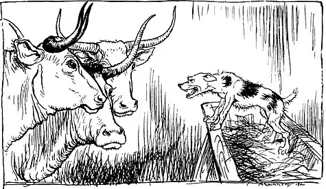 A DOG was lying in a Manger on the hay which had been put there for the cattle, and when they came and tried to eat, he growled and snapped at them and wouldn’t let them get at their food. “What a selfish beast,” said one of them to his companions; “he can’t eat himself and yet he won’t let those eat who can.”