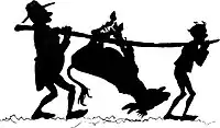 “Anything to please you,” said the old man, “we can but try.” So they got off, tied the Ass’s legs together with a rope and slung him on a pole, and at last reached the town, carrying him between them. This was so absurd a sight that the people ran out in crowds to laugh at it, and chaffed the Father and Son unmercifully, some even calling them lunatics. They had then got to a bridge over the river, where the137