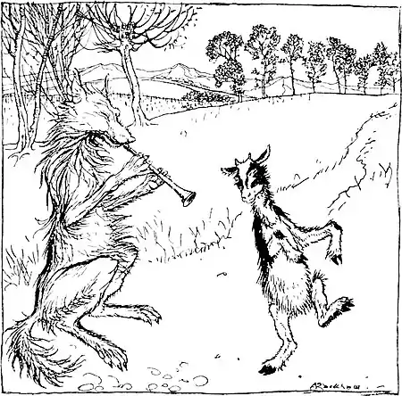 A KID strayed from the flock and was chased by a Wolf. When he saw he must be caught he turned round and said to the Wolf, “I know, sir, that I can’t escape being eaten by you: and so, as my life is bound to be short, I pray you let it be as merry as may be. Will you not play me a tune to dance to before I die?” The Wolf saw no objection to having some music before his dinner: so he took out his pipe and began to play, while the Kid151
