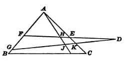 harmonics: If from D we draw DF, cutting the triangle ABC, and choose H on it, so that DE:DF=EH:HF, and if we draw the line AH, then every transversal through D, such as DG, will be divided by AH so that DK:DG=KJ:JG. Menelaus of Alexandria (about 98 A.D.) was the author of Sphœrica, a work extant in Hebrew and Arabic, but not