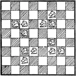 I have shown in the diagram how twelve knights (the fewest possible that will perform the feat) may be placed on the chessboard so that every square is either occupied or attacked by a knight. Examine every square in turn, and you will find that this is so. Now, the puzzle in this case is to discover what is the smallest possible number of knights that is required in order that every square shall be either occupied or attacked, and every knight protected by another knight. And how would you arrange them? It will be found that of the twelve shown in the diagram only four are thus protected by being a knight's move from another knight.