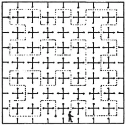 A wicked baron in the good old days imprisoned an innocent maiden in one of the deepest dungeons beneath the castle moat. It will be seen from our illustration that there were sixty-three cells in the dungeon, all connected by open doors, and the maiden was chained in the cell in which she is shown. Now, a valiant knight, who loved the damsel, succeeded in rescuing her from the enemy. Having gained an entrance to the dungeon at the point where he is seen, he succeeded in reaching the maiden after entering every cell once and only once. Take your pencil and try to trace out such a route. When you have succeeded, then try to discover a route in twenty-two straight paths through the cells. It can be done in this number without entering any cell a second time.