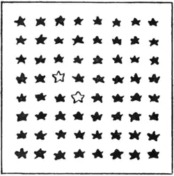 Put the point of your pencil on one of the white stars and (without ever lifting your pencil from the paper) strike out all the stars in fourteen continuous straight strokes, ending at the second white star. Your straight strokes may be in any direction you like, only every turning must be made on a star. There is no objection to striking out any star more than once.