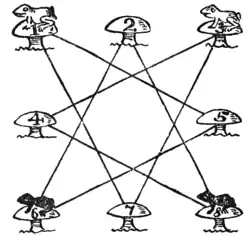 In the illustration we have eight toadstools, with white frogs on 1 and 3 and black frogs on 6 and 8. The puzzle is to move one frog at a time, in any order, along one of the straight lines from toadstool to toadstool, until they have exchanged places, the white frogs being left on 6 and 8 and the black ones on 1 and 3. If you use four counters on a simple diagram, you will find this quite easy, but it is a little more puzzling to do it in only seven plays, any number of successive moves by one frog counting as one play. Of course, more than one frog cannot be on a toadstool at the same time.