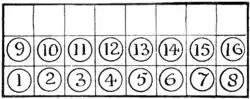 The puzzle is to remove all the counters except one, and this one that is left must be No. 1. You remove a counter by jumping over another counter to the next space beyond, if that square is vacant, but you cannot make a leap in a diagonal direction. The following moves will make the play quite clear: 1—9, 2—10, 1—2, and so on. Here 1 jumps over 9, and you remove 9 from the board; then 2 jumps over 10, and you remove 10; then 1 jumps over 2, and you remove 2. Every move is thus a capture, until the last capture of all is made by No. 1.