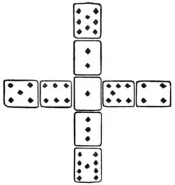 In this case we use only nine cards—the ace to nine of diamonds. The puzzle is to arrange them in the form of a cross, exactly in the way shown in the illustration, so that the pips in the vertical bar and in the horizontal bar add up alike. In the example given it will be found that both directions add up 23. What I want to know is, how many different ways are there of rearranging the cards in order to bring about this result? It will be seen that, without affecting the solution, we may exchange the 5 with the 6, the 5 with the 7, the 8 with the 3, and so on. Also we may make the horizontal and the vertical bars change places. But such obvious manipulations as these are not to be regarded as different solutions. They are all mere variations of one fundamental solution. Now, how many of these fundamentally different solutions are there? The pips need not, of course, always add up 23.
