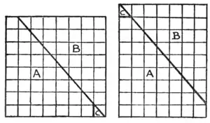 "You see there are sixty-four squares—eight by eight. Now I draw a straight line from the top left-hand corner, where the first and second squares meet, to the bottom right-hand corner. I cut along this line with the scissors, slide up the piece that I have marked B, and then clip off the little corner C by a cut along the first upright line. This little piece will exactly fit into its place at the top, and we now have
