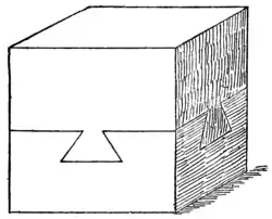 Here is a curious mechanical puzzle that was given to me some years ago, but I cannot say who first invented it. It consists of two solid blocks of wood securely dovetailed together. On the other two vertical sides that are not visible the appearance is precisely the same as on those shown. How were the pieces put together? When I published this little puzzle in a London newspaper I received (though they were unsolicited) quite a stack of models, in oak, in teak, in mahogany, rosewood, satin-wood, elm, and deal; some half a foot in length, and others varying in size right down to a delicate little model about half an inch square. It seemed to create considerable interest.