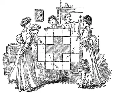 The lady members of the Wilkinson family had made a simple patchwork quilt, as a small Christmas present, all composed of square pieces of the same size, as shown in the illustration. It only lacked the four corner pieces to make it complete. Somebody pointed out to them that if you unpicked the Greek cross in the middle and then cut the stitches along the dark joins, the four pieces all of the same size and shape would fit together and form a square. This the reader knows, from the solution in Fig, 39, is quite easily done. But George Wilkinson suddenly suggested to them this poser. He said, "Instead of picking out the cross entire, and forming the square from four equal pieces, can you cut out a square entire and four equal pieces that will form a perfect Greek cross?" The puzzle is, of course, now quite easy.