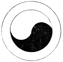 Here is a symbol of tremendous antiquity which is worthy of notice. It is borne on the Korean ensign and merchant flag, and has been adopted as a trade sign by the Northern Pacific Railroad Company, though probably few are aware that it is the Great Monad, as shown in the sketch below. This sign is to the Chinaman what the cross is to the Christian. It is the sign of Deity and eternity, while the two parts into which the circle is divided are called the Yin and the Yan—the male and female forces of nature. A writer on the subject more than three thousand years ago is reported to have said in reference to it: "The illimitable produces the great extreme. The great extreme produces the two principles. The two principles produce the four quarters, and from the four quarters we develop the quadrature of the eight diagrams of Feuh-hi." I hope readers will not ask me to explain this, for I have not the slightest idea what it means. Yet I am persuaded that for ages the symbol has had occult and probably mathematical meanings for the esoteric student.