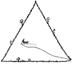 Here is a little problem that everybody should know how to solve. The goat is placed in a half-acre meadow, that is in shape an equilateral triangle. It is tethered to a post at one corner of the field. What should be the length of the tether (to the nearest inch) in order that the goat shall be able to eat just half the grass in the field? It is assumed that the goat can feed to the end of the tether.