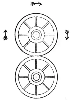 In the accompanying illustration we have two wheels. The lower one is supposed to be fixed and the upper one running round it in the direction of the arrows. Now, how many times does the upper wheel turn on its own axis in making a complete revolution of the other wheel? Do not be in a hurry with your answer, or you are almost certain to be wrong. Experiment with two pennies on the table and the correct answer will surprise you, when you succeed in seeing it.