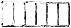 Here is a new little puzzle with matches. It will be seen in the illustration that thirteen matches, representing a farmer's hurdles, have been so placed that they enclose six sheep-pens all of the same size. Now, one of these hurdles was stolen, and the farmer wanted still to enclose six pens of equal size with the remaining twelve. How was he to do it? All the twelve matches must be fairly used, and there must be no duplicated matches or loose ends.
