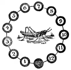 It has been suggested that this puzzle was a great favourite among the young apprentices of the City of London in the sixteenth and seventeenth centuries. Readers will have noticed the curious brass grasshopper on the Royal Exchange. This long-lived creature escaped the fires of 1666 and 1838. The grasshopper, after his kind, was the crest of Sir Thomas Gresham, merchant grocer, who died in 1579, and from this cause it has been used as a sign by grocers in general. Unfortunately for the legend as to its origin, the puzzle was only produced by myself so late as the year 1900. On