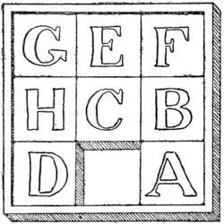 Here is a little reminiscence of our old friend the Fifteen Block Puzzle. Eight wooden blocks are lettered, and are placed in a box, as shown in the illustration. It will be seen that you can only move one block at a time to the place vacant for the time being, as no block may be lifted out of the box. The puzzle is to shift them about until you get them in the order—