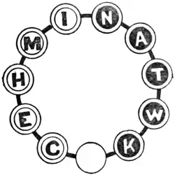 In the illustration we have eleven discs in a circle. On five of the discs we place white counters with black letters—as shown—and on five other discs the black counters with white letters. The bottom disc is left vacant. Starting thus, it is required to get the counters into order so that they spell the word "Twickenham" in a clockwise direction, leaving the vacant disc in the original position. The black counters move in the direction that a clock-hand revolves, and the white counters go the opposite way. A counter may jump over one of the opposite colour if the vacant disc is next beyond. Thus, if your first move is with K, then C can jump over K. If then K moves towards E, you may next jump W over C, and so on. The puzzle may be solved in twenty-six moves. Remember a counter cannot jump over one of its own colour.