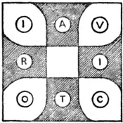 The diagram, it will be seen, is composed of nine divisions. The puzzle is to place eight counters, bearing the letters of the word VICTORIA, exactly in the manner shown, and then slide one letter at a time from black to white and white to black alternately, until the word reads round in the same direction, only with the initial letter V on one of the black arms of the cross. At no time may two letters be in the same division. It is required to find the shortest method.