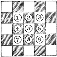 as few times as possible. It does not matter whether the two coins passed over are in one or two plates, nor how many empty plates you pass a coin over. But you must always go in one direction round the table and end at the point from which you set out. Your hand, that is to say, goes steadily forward in one direction, without ever moving backwards.