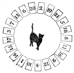 This is a modern version, with a difference, of an old puzzle of the same name. Number twenty-one cards, 1, 2, 3, etc., up to 21, and place them in a circle in the particular order shown in the illustration. These cards represent mice. You start from any card, calling that card "one," and count, "one, two, three," etc., in a clockwise direction, and when your count agrees with the number on the card, you have made a "catch," and you remove the card. Then start at the next card, calling that "one," and try again to make another "catch." And so on. Supposing you start at 18, calling that card "one," your first "catch" will be 19. Remove 19 and your next "catch " is 10. Remove 10 and your next "catch" is 1. Remove the 1, and if you count up to 21 (you must never go beyond), you cannot make another "catch." Now, the ideal is to "catch" all the twenty-one mice, but this is not here possible, and if it were it would merely require twenty-one different trials, at the most, to succeed. But the reader may make any two cards change places before he begins. Thus, you can change the 6 with the 2, or the 7 with the 11, or any other pair. This can be done in several ways so as to enable you to "catch" all the twenty-one mice, if you then start at the right place. You may never pass over a "catch"; you must always remove the card and start afresh.