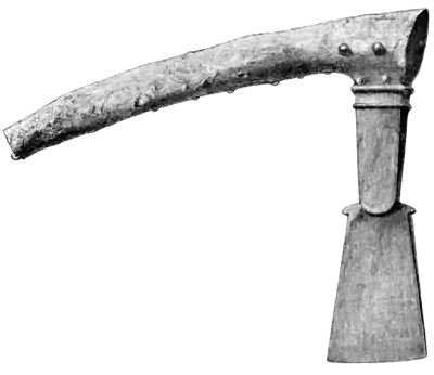 round-headed nails about ¾ inch apart. This plating is turned over square at the end of the handle, where there is a little projecting bronze eye, through which a ring may have passed, so as to serve for its suspension. At the sides above the celt there are some larger round-headed nails, or possibly rivets; and the end of the branch which goes into the socket appears to be secured by a rivet, which passes through from face to face. At the end of the handle itself, above the celt, is a nearly circular flat bronze plate,