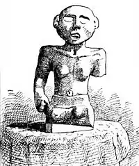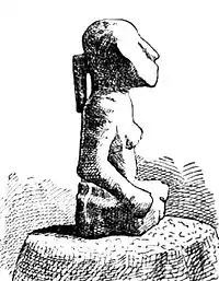 A few days before I was at the great mound, a rude stone effigy of a female was plowed out near its base on the north side. It is quite grotesque, resembling the uncouth carvings in wood of the Indians of the north, Its height is 14 inches, its weight 36 pounds, and the material is the limestone of the region.