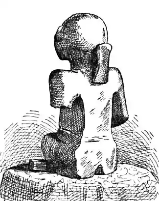 I have a photograph of it, viewed on three sides. On the hips and back are colored zigzag lines of white and brown, intended for ornament. Some years since a male, probably the mate to it, was plowed out near the same place; also an earthen vase and other pottery, with flint disks. The first found image was lost or destroyed, and the other soon will be. In style and artist to execution they appear to be the work of the present red man.