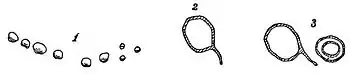 Fig. 1 represents hemispherical depressions or holes in the floor of the cavern, near the left entrance and a few inches from the wall. They are arranged in an arc-shaped row, with concave side to the wall. Fig. 2 and the first character in Fig. 3, which occur above Fig. 1, on the wall, are incised circles, each 7 inches in diameter, and have each a single ray pointing downward and to the right. The other character of Fig. 3 consists of two concentric circles, the outer one measuring 5¼ inches in diameter, and the inner one 3 inches.