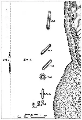 From 1 to 2 is 39 feet from center to center, from 2 to 3 is 30 feet from center to center, from 3 to 4 is 50 feet from center to center. This last mound is 80 feet long, with a cross mound at the center 33 feet long, 2 feet high, and 10 feet wide. The principal mound is 15 feet wide.