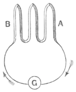 the lower remain cool, we get a strong current going from the bismuth to the antimony across the heated junctions, and we may pass the current so produced round the wire of a galvanometer, and thus, by increasing the number of our junctions, and also by using a very delicate galvanometer, we may get a very perceptible effect for the smallest heating of the upper junctions. This arrangement is called the thermopile, and, in conjunction with the reflecting galvanometer, it affords the most delicate means known for detecting small quantities of heat.