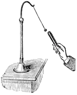 Now, what the excited glass did to the pith ball, was to communicate to it part of its own influence, after which the ball was repelled by the glass; or, in other words, bodies charged with similar electricities repel one another.