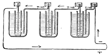 battery, but rather to give such an account as will enable our readers to understand what the arrangement is, and what sort of effect it produces; and with this object we shall at once proceed to describe the battery of Grove, which is perhaps the most efficacious of all the various arrangements for the purpose of producing an electric current. In this battery we have a number of cells connected together, as in Fig. 8, which shows a battery of three cells. Each cell consists of two vessels, an outer and an inner one; the outer vessel being made of glass or ordinary stone ware, while the inner one is made of unglazed porcelain, and is therefore porous. The outer vessel is filled with dilute sulphuric acid, and a plate of amalgamated zinc—that is to say, of metallic zinc having its outer surface brightened with mercury,—is immersed in this acid. Again, in the inner or porous vessel we have strong nitric acid, in which a plate of platinum foil is immersed, this being at the same time electrically connected with the zinc plate of the next outer vessel, by means of a clamp, as in the figure. Both metals must be clean where they are pressed together, that is to say, the true metallic surfaces of both must be in contact. Finally, a wire is metallically connected with the platinum of the left-hand cell, and a similar wire with the