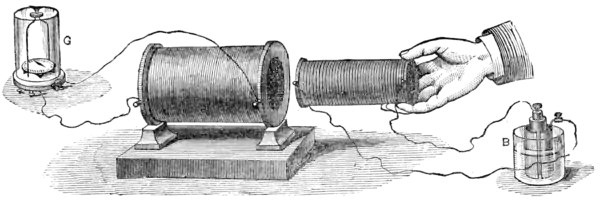 currents upon each other. Let us suppose (Fig. 10) that we have two circular coils of wire, covered with thread, and placed near each other. Let both the extremities of the right-hand coil be connected with the poles of a battery, so as to make a current of electricity circulate round the coil. On the other hand, let the left-hand coil be connected with a galvanometer, thus enabling us to detect the smallest current of electricity which may pass through this coil. Now, it is found that when we first connect the right-hand coil, so as to pass the battery current through it, a momentary current will pass through the left-hand coil, and will deflect the needle of the